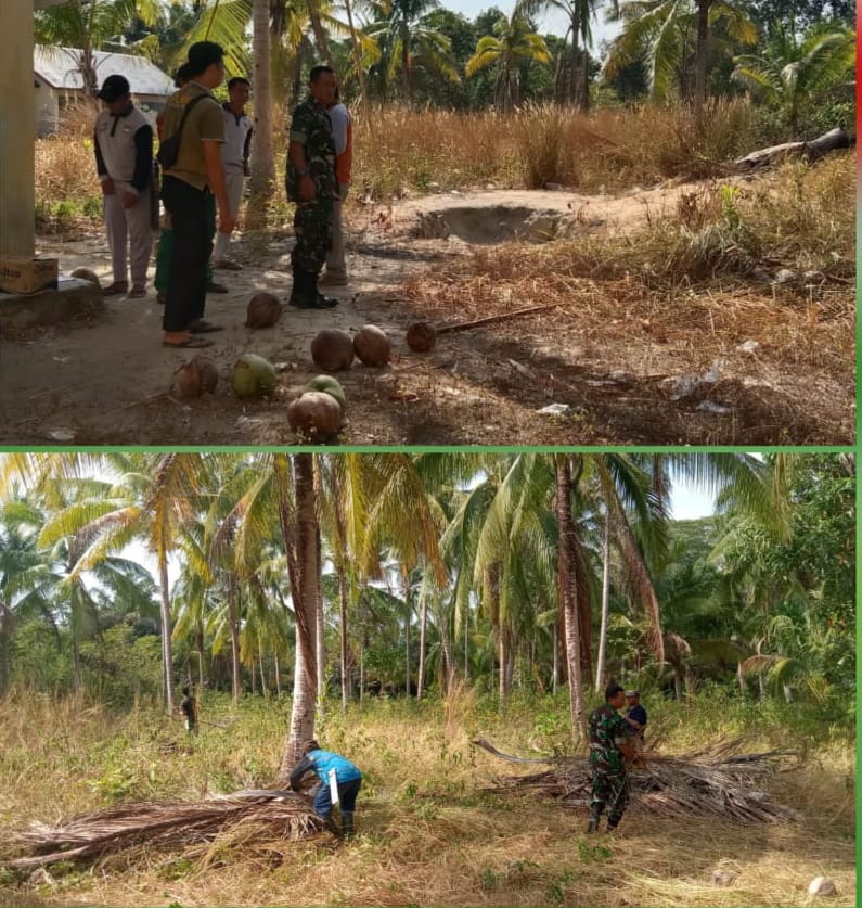 Simpang Pesak, Okeybung.com – Anggota Koramil 414-03/Gantung Serda Afrizal Kurniawan, Babinsa Desa Batu Itam Kecamatan Simpang Pesak bergotong royong membersihkan kebun pohon kelapa di Belakang Kantor Polmas Dusun Batu Itam, Sabtu (14/10/2023).