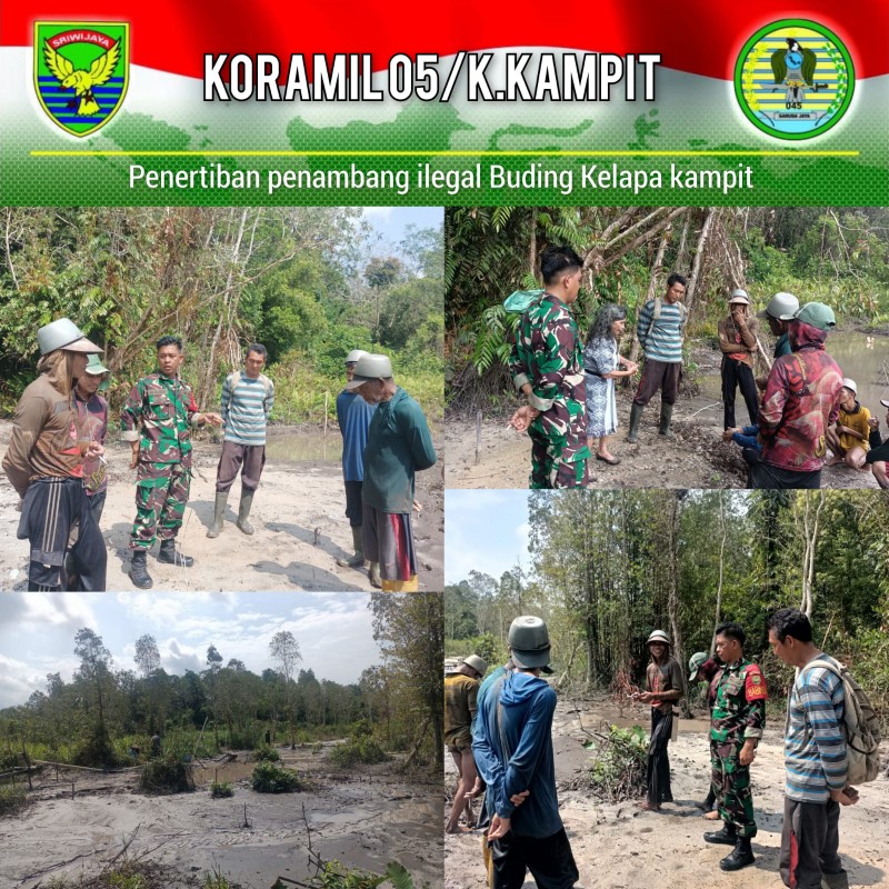 Kelapa Kampit, Okeybung.com – Anggota Koramil 414-05/Kelapa Kampit Babinsa Desa Buding Sertu Ahmad Redi melaksanakan pendampingan penertiban tambang rajuk suntik yang memasuki lahan masyarakat dan lahan pemukiman Dusun Buding Desa Buding, Kecamatan Kelapa Kampit, Rabu (31/5/2023).
