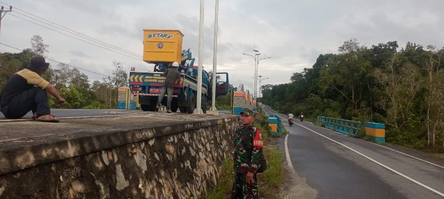 Tanjung Pandan, OkeyBung.com Anggota Koramil 414-01/Tanjung Pandan Serda I Putu Swastika, Babinsa Desa Sijuk, monitoring pemasangan lampu penerangan jalan di Desa Sijuk Pelabuhan Munsang, Simpang Batu Bedil, Kamis (18/1/2024).