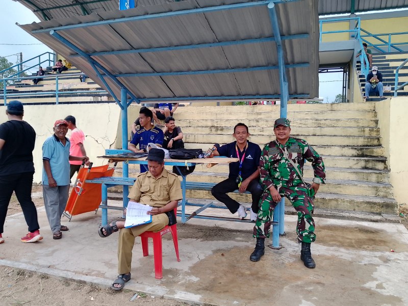 Kelapa Kampit, Okeybung.com Anggota Koramil 414-05/Kelapa Kampit Serda Firdiansyah Babinsa Desa Meyang melaksanakan pengamanan turnamen sepak bola Qoreka Cup 2023, Selasa (10/10/2023).