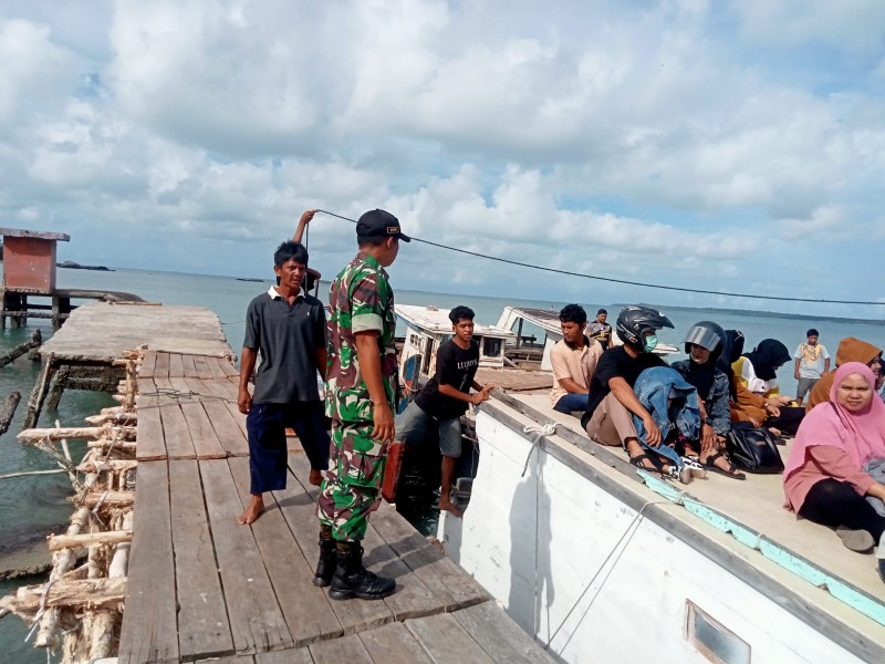 Babinsa memonitor dan membantu warga yang akan menyebrang ke pulau seliu menggunakan jalur penyeberangan kapal ke desa Pulau Seliu.
