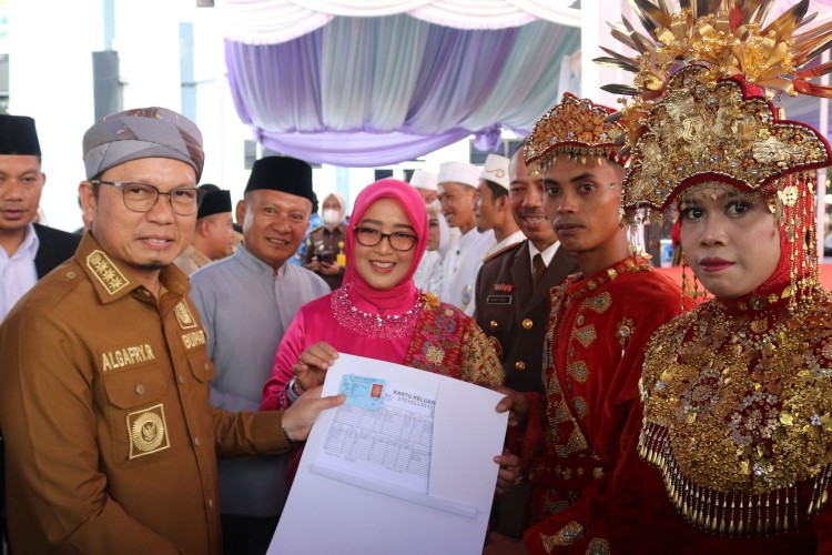 Bupati Bangka Tengah (Bateng) saat memberikan KTP dan KK kepada pasangan pengantin.