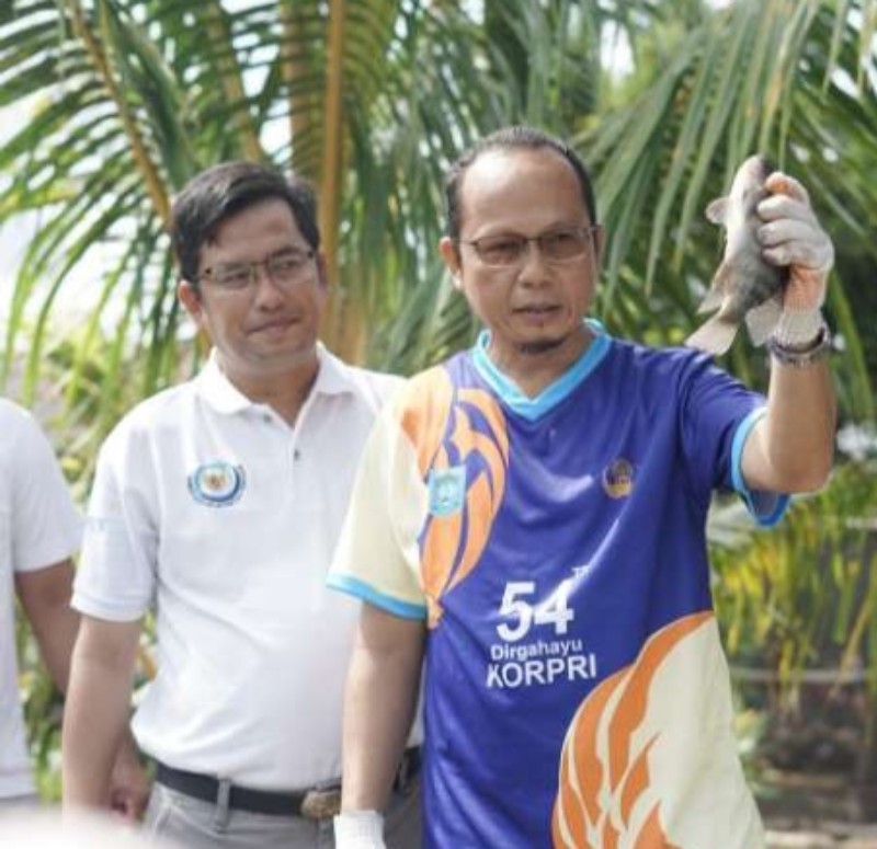Bupati Bangka Tengah, Algafry Rahman, didampingi Kepala Dinas Perikanan Bateng, Imam Soehadi, secara langsung memanen ikan nila salin milik Isroni, Ketua Pokdakan BLA Desa Terentang III.