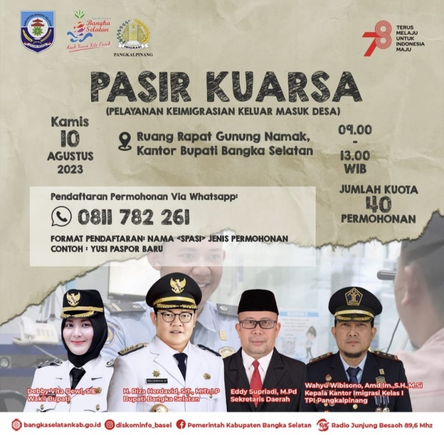 “Melalui kesempatan ini, kita ingin menyampaikan kepada seluruh masyarakat Bangka Selatan, khususnya Toboali dan sekitarnya, bahwa Divisi Keimigrasian Pangkalpinang bersama dengan Pemerintah Kabupaten Bangka Selatan akan membuka kembali layanan pembuatan/perpanjangan dokumen passport yang Pelaksanaannya sendiri akan dilaksanakan pada Hari Kamis 10 Agustus 2023 di Kantor Bupati Bangka Selatan,” ujar Yuri di ruang kerjanya, Rabu (2/8/23).