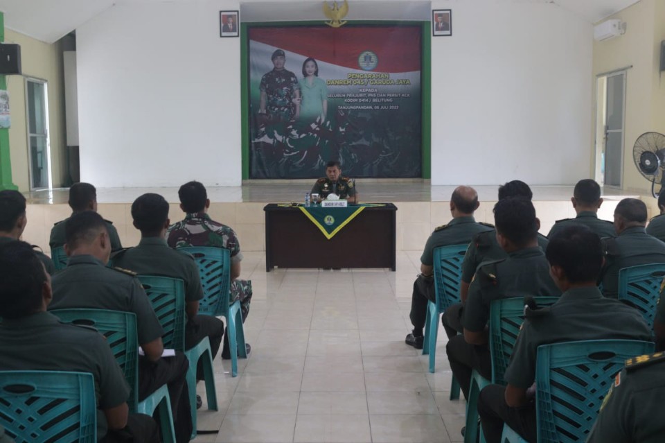 Tanjungpandan, OkeyBung.com – Komandan Kodim 0414/Belitung Letkol Inf Herik Prasetiawan memberikan Jam Komandan untuk awal tahun baru 2024 kepada seluruh anggota baik prajurit maupun PNS di Aula Makodim 0414/Belitung, Rabu (03/01/2024).