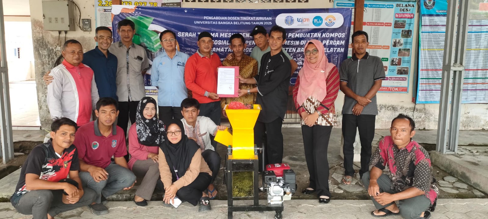 BANGKA SELATAN, OkeyBung.com – Kehidupan masyarakat desa kini semakin dekat dengan sentuhan teknologi, terutama berkat kolaborasi antara dunia akademik dan pemerintahan desa. Sebagai bagian dari program Pengabdian Dosen Tingkat Jurusan Universitas Bangka Belitung Tahun 2025, Jurusan Teknologi Industri dan Rekayasa Pertambangan, Fakultas Sains dan Teknik UBB. Tim pengabdian terdiri dari dosen prodi teknik mesin dan teknik elektro serta mahasiswa UBB telah melaksanakan kegiatan serah terima mesin pencacah bahan pembuatan kompos sekaligus sosialisasi penggunaan mesin tersebut di Desa Pergam, Kecamatan Airgegas, Kabupaten Bangka Selatan.