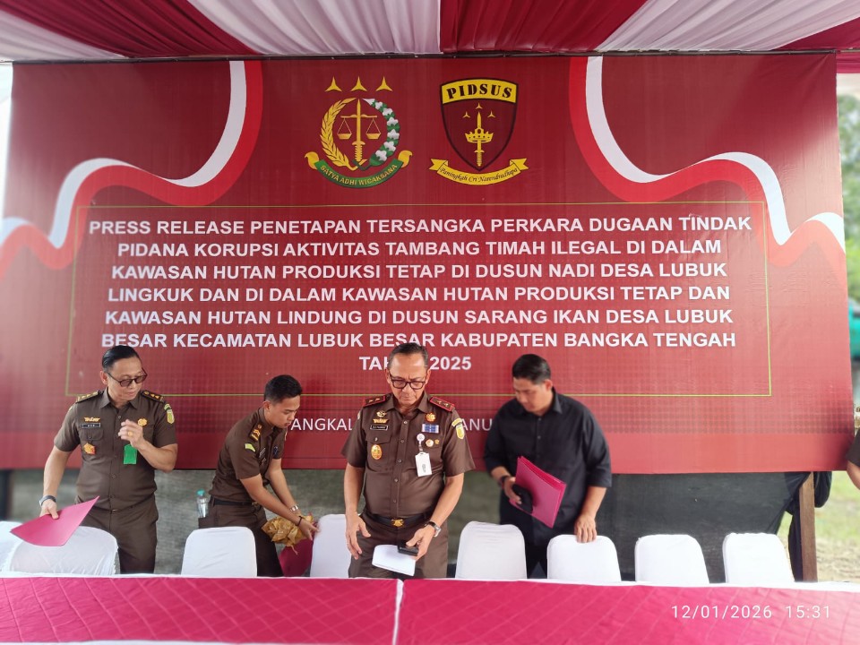 PANGKALPINANG, OkeyBung.com – Kejaksaan Tinggi Kepulauan Bangka Belitung (Kejati Babel) menetapkan empat tersangka dalam kasus dugaan penambangan timah ilegal di kawasan hutan produksi dan hutan lindung Kecamatan Lubuk Besar, Kabupaten Bangka Tengah. Dalam perkara ini, kerugian negara ditaksir mencapai Rp 89,7 miliar.