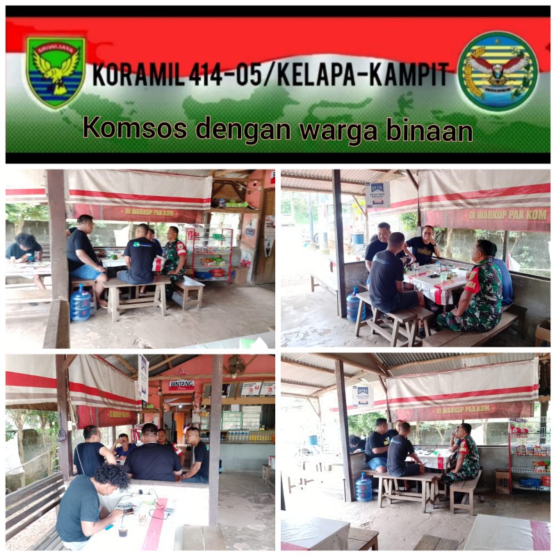 Kelapa Kampit, OkeyBung.com – Anggota koramil 414-05/Kelapa Kampit, Babinsa Desa Mayang, Serda Firdiansyah melaksanakan Komunikasi Sosial (Komsos) dengan warga binaan, bertempat di warung kopi pak Edi Suhatman Dusun Balai Selatan Desa Mayang Kecamatan Kelapa Kampit Kabupaten Belitung Timur, Minggu (10/4/2024).