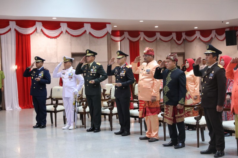 Mengenakan busana adat melayu, Pj Gubernur Safrizal nampak khidmat mengikuti jalannya Upacara Detik- Detik Proklamasi Kemerdekaan RI yang ditayangkan secara serentak mulai pukul 10.00 WIB atau 11.00 WITA daerah setempat.