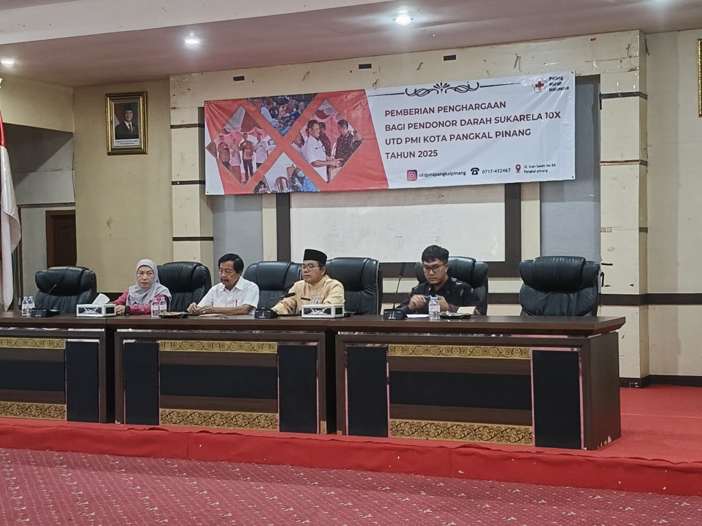 PANGKALPINANG, OkeyBung.com Sebanyak 101 pendonor darah sukarela menerima penghargaan dari Palang Merah Indonesia (PMI) Kota Pangkalpinang atas kontribusi mereka yang telah mendonorkan darah sebanyak 10 kali. Acara ini berlangsung di Balai Betason (OR), Lantai 1 Kantor Wali Kota Pangkalpinang, Kamis (3/7/2025), dengan dihadiri oleh pejabat daerah dan tokoh PMI dari berbagai tingkatan.