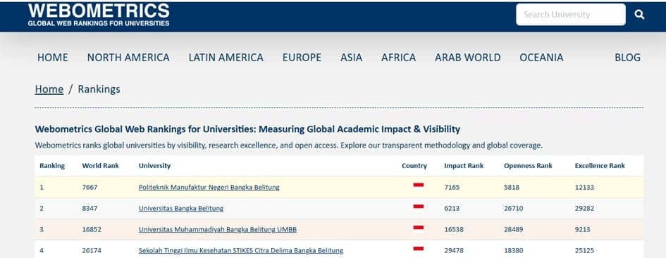 Dalam pemeringkatan Webometric versi terbaru, Polman Babel unggul dibandingkan sejumlah perguruan tinggi lain di kepulauan Bangka Belitung, menegaskan posisi kampus sebagai institusi yang adaptif terhadap transformasi digital pendidikan.