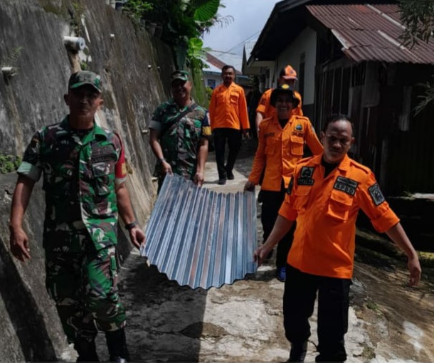 Tanjung Pandan, OkeyBung.com – Babinsa Kelurahan Kota Serka Astiyandi mendampingi BPBD Kabupaten Belitung menyerahan bantuan kepada korban rumah rusak akibat tertimpa pohon aren yang terjadi pada Sabtu (13/1/2024) malam.
