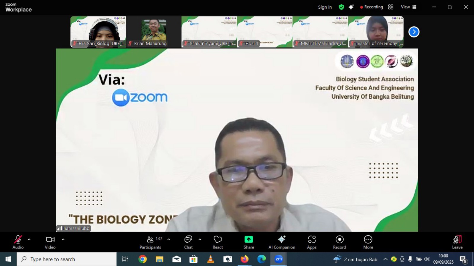 BANGKA, OkeyBung.com – Himpunan Mahasiswa Biologi (HIMABIO) Universitas Bangka Belitung kembali menggelar Biozone 11th International dengan tema “Rehabilitation of Post-Tin Mining Ecosystems: Integrating Botany, Microbiology, and Zoology for Sustainable Conservation.” Acara pembukaan berlangsung secara daring melalui Zoom Meeting pada Selasa (9/9/2025).
